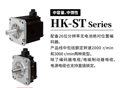 配备26位分辨率无电池绝对位置编码器。产品线中包括额定转速2000 r/min和3000 r/min两种类型。除了编码器电缆/电磁制动器电缆,电源电缆也支持直插锁定。