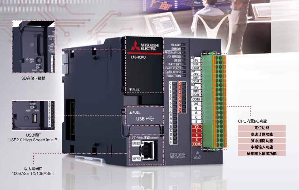 内置SD存储卡槽 内置的SD存储卡槽,非常便于进行程序升级和设备的批量生产。 另外SD存储卡上可以记录数据*1,对把握分析设备的状态和生 产状况有很大的帮助。