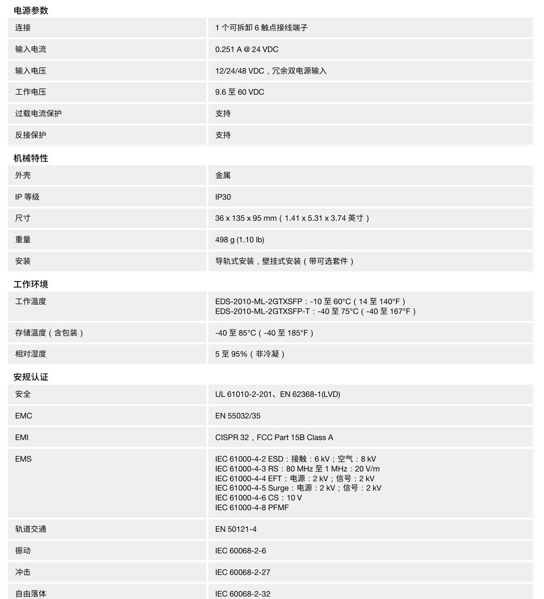 EDS-2010-ML 系列支持 12/24/48 VDC 冗余双电源输入、导轨式安装和高水平 EMI/EMC 等级。除了体积小巧外,EDS-2010-ML系列通过了 100%烧机测试,以确保其在现场能够可靠地运行。EDS-2010-ML系列支持 -10至 60'℃ 标准温度,还提供 -40 至 75'℃ 宽温型号。