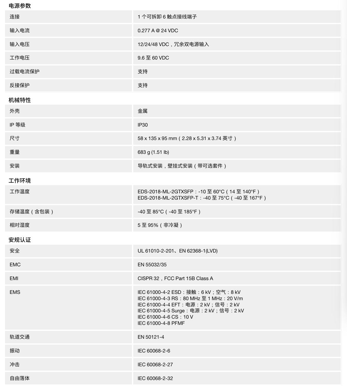 EDS-2018-ML 系列支持 12/24/48 VDC 冗余双电源输入、导轨式安装和高水平 EMI/EMC 等级。除了体积小巧外,EDS-2018-ML 系列通过了 100% 烧机测试,以确保其在现场能够可靠地运行。EDS-2018-ML 系列支持 -10至 60°℃ 标准温度,还提供 -40 至 75°℃ 宽温型号。