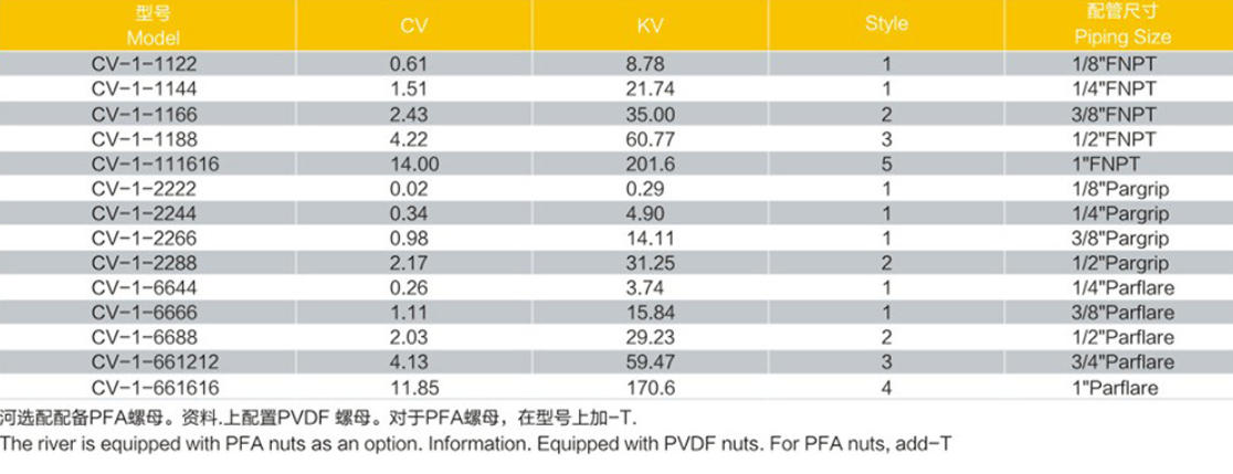 CV-1PTFE止回阀专为高纯度半导体应用而设计,也是超纯水和侵蚀性化学或气体应用的理想选择。该设计采用机加工的PTFE组件,提供卓越的耐化学性和纯度,而不需要〇形密封圈。机加工的PTFE弹簧允许低开裂压力操作和最小的背压重新密封。