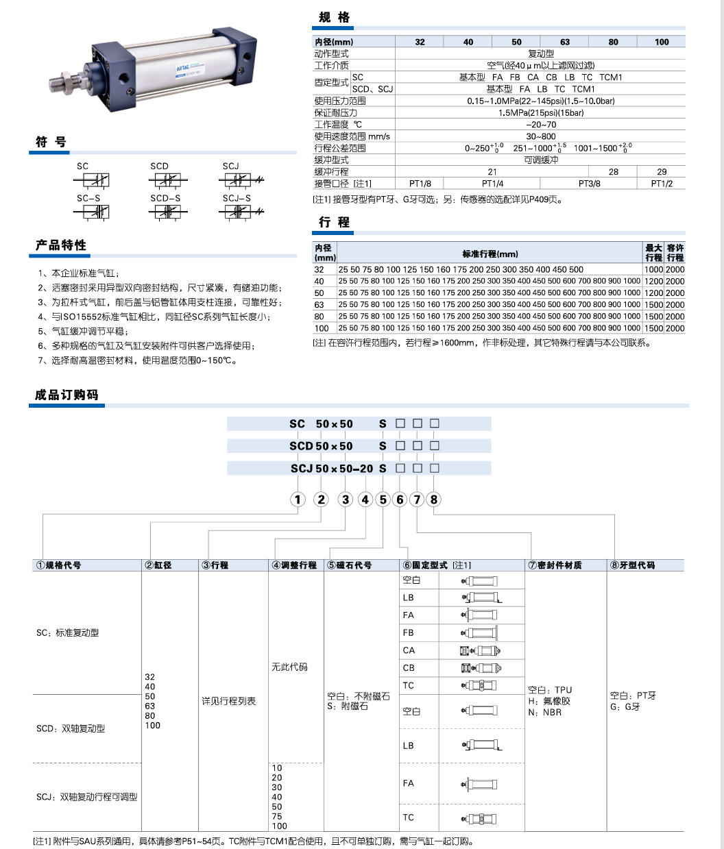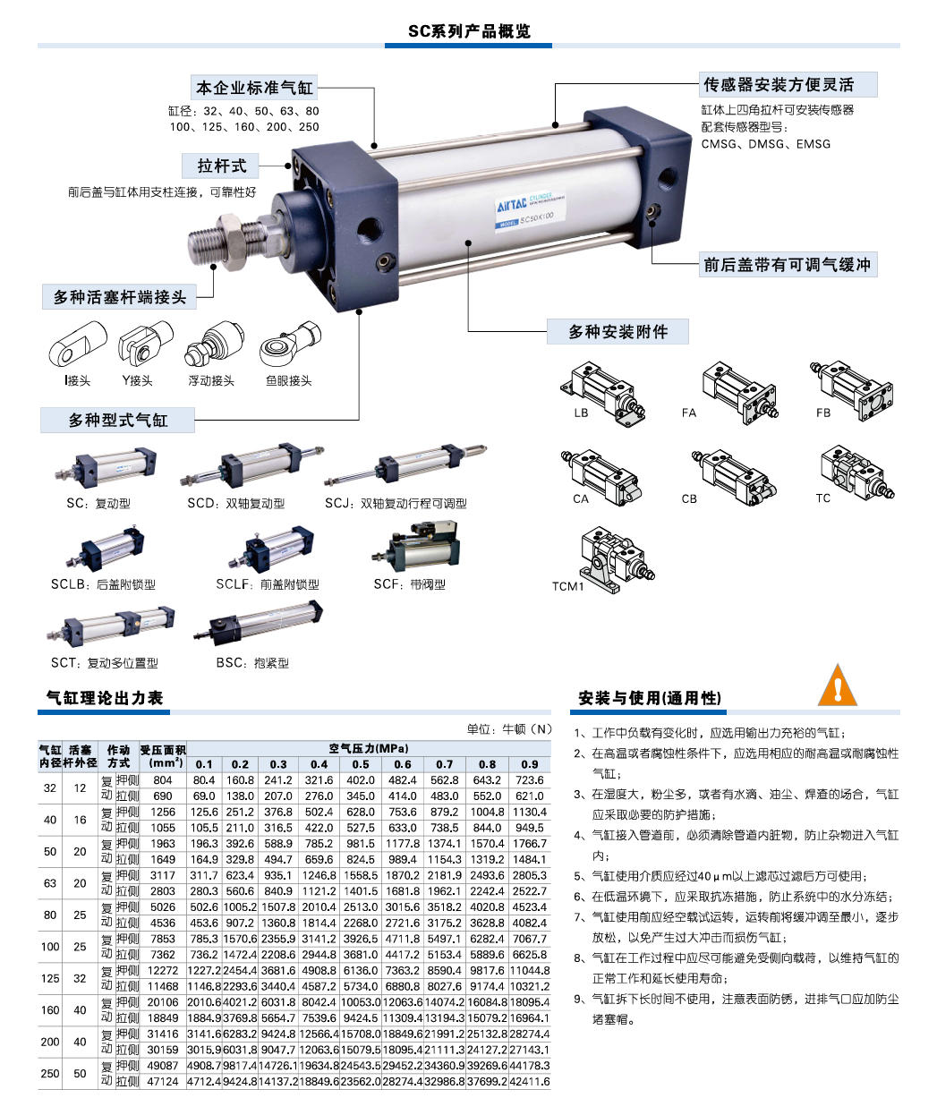 2、活塞密封采用异型双向密封结构,尺寸紧凑,有储油功能;3、为拉杆式气缸,前后盖与铝管缸体用支柱连接,可靠性好;4、与ISO15552标准气缸相比,同缸径SC系列气缸长度小;